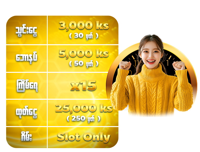 🌟 ႀကိမ္ေရ 15 ဆလုပ္ၿပီးထုတ္ေငြ 25,000 (250 )မွတ္ထုတ္ ႏိုင္မည္ ။